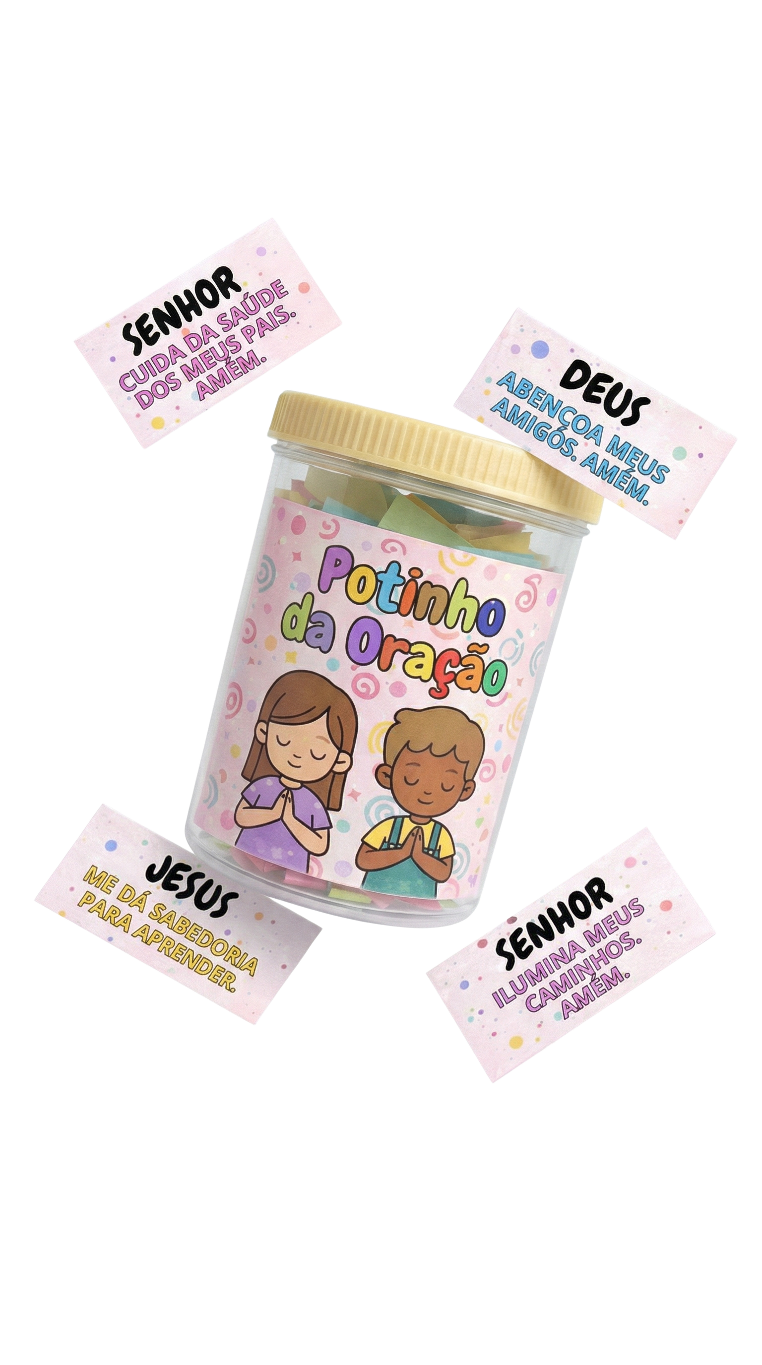 "Minha filha tem só 2 aninhos mas já entende! As orações são curtinhas e coloridas, ela adora as cores. Todo dia ela mesma vai buscar o potinho. Tá aprendendo a falar com Deus desde pequenina. Gratidão por esse projeto!"